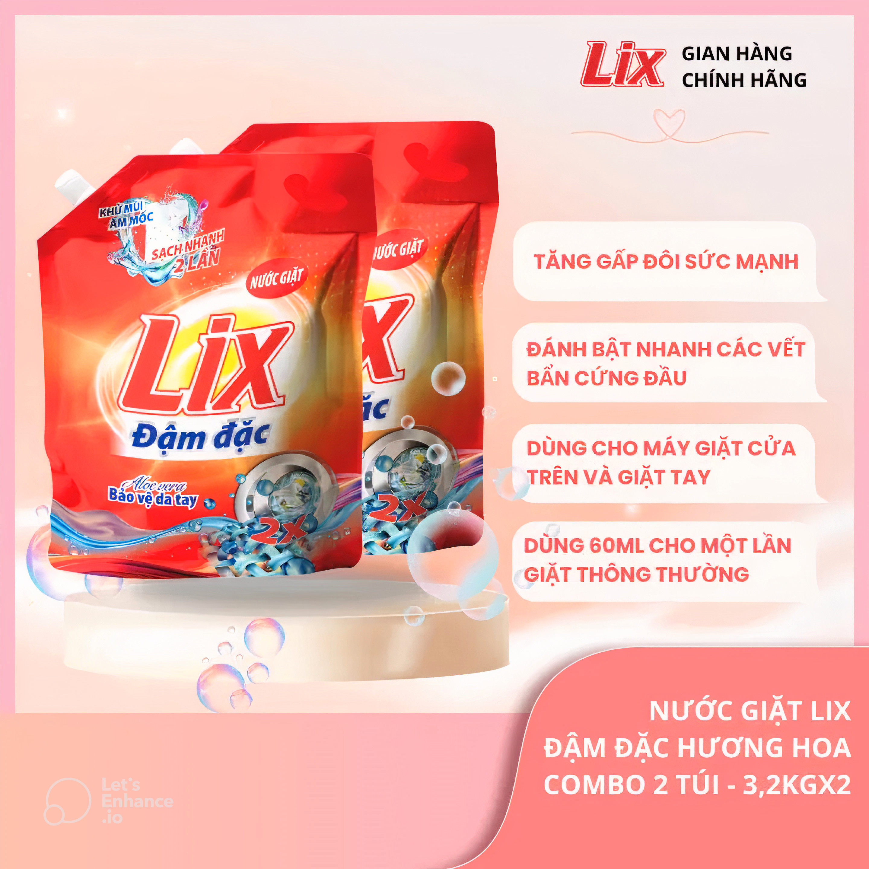 + Nước giặt Lix hương hoa dịu mát đậm đặc hơn, sẽ thấm sâu vào từng thớ vải, vừa giặt sạch dễ dàng hơn, vừa lưu lại mùi hương thơm mát gấp 2 lần so với bột giặt, cho quần áo của bạn thật sạch và tỏa hương thơm ngát.